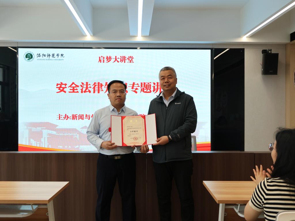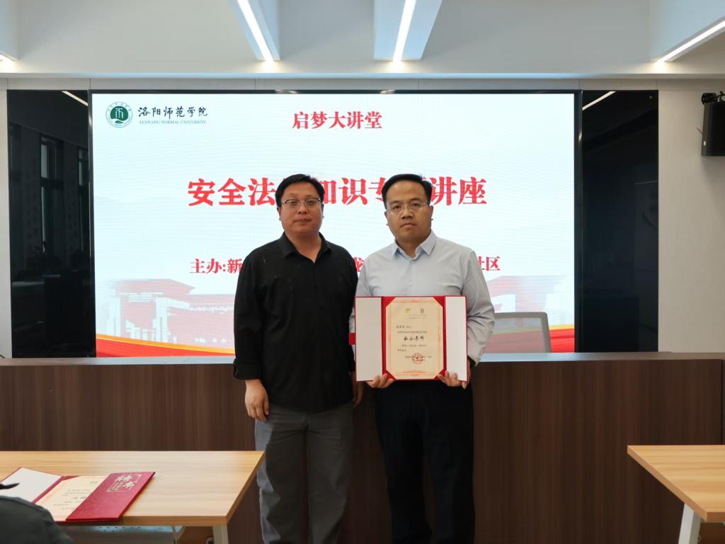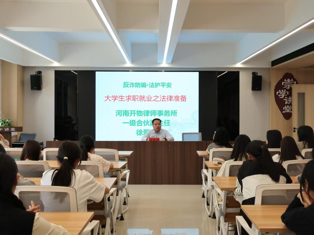 4月24日下午,由文学院与龙门书院二号学生社区联合承办的启梦大讲堂系列讲座之“反诈防骗·法护平安”专题讲座在龙门书院二号学生社区崇学讲堂举行。本次讲座由河南开物律师事务所律师徐爱国主讲,书院党委书记张方方、院长韩守东及各年级朋辈导师参加讲座。讲座由育人导师郝帅昌主持。