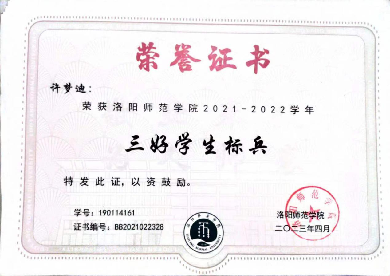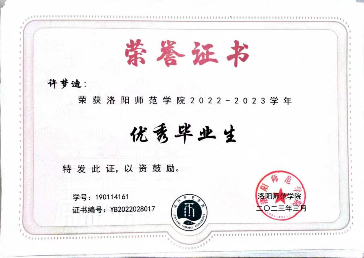许梦迪,女,洛阳师范学院文学院2019级汉语言文学专业学生,2023年通过公开招聘考入郑州市金水区一所小学。在校期间曾荣获“优秀团员”、“三好学生”、“洛阳师范学院优秀毕业生”等荣誉称号。
