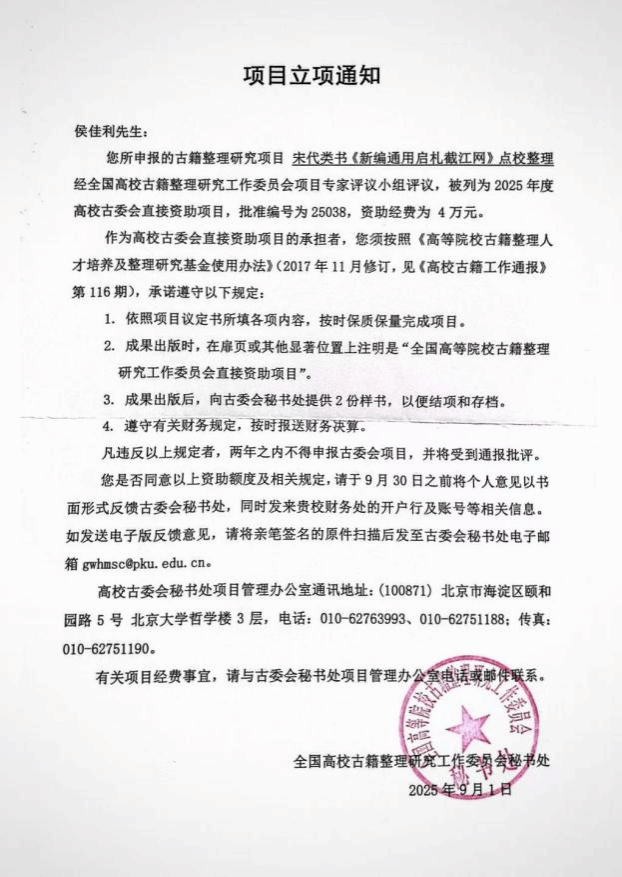 近日,全国高校古籍整理研究工作委员会项目专家评议工作落下帷幕,我院教师侯佳利申报的“宋代类书《新编通用启札截江网》点校整理”被列为2025年度高校古委会直接资助项目(批准编号:25038)。该项目对宋代类书《新编通用启札截江网》进行标点整理,使这一珍贵文献在保持历史本真性的前提下,转化为符合当代学术研究与知识传播需求的规范化文本形态,推动其从典藏文物向开放学术资源的价值转变。