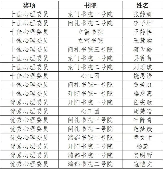 初冬已至,霜华初染,风有凉意却未凛冽,叶有疏落仍含生机。十月的心理健康活动,恰似这初冬里的一抹暖阳、一缕清风,为校园添了温情、增了力量。用创意搭建心灵桥梁,用真诚传递温暖力量,让心理健康的种子在校园里生根发芽。活动期间,“寝系温情,趣享生活”“十佳心理委员评选”“心理微电影”等系列内容有序开展,全校师生积极参与,涌现出众多优秀作品与个人。现将获奖名单公布如下:
