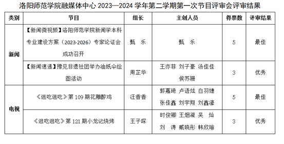 经评审,电视栏目《逛吃逛吃》第109期《花椰醉鸡》和微视频《洛阳师范学院新闻学本科专业建设方案(2023-2026)专家论证会成功召开》被评为最佳节目;《逛吃逛吃》第121期《小龙记烧烤》和新闻速递《豫见非遗社团举办油纸伞绘图活动》被评优秀节目。