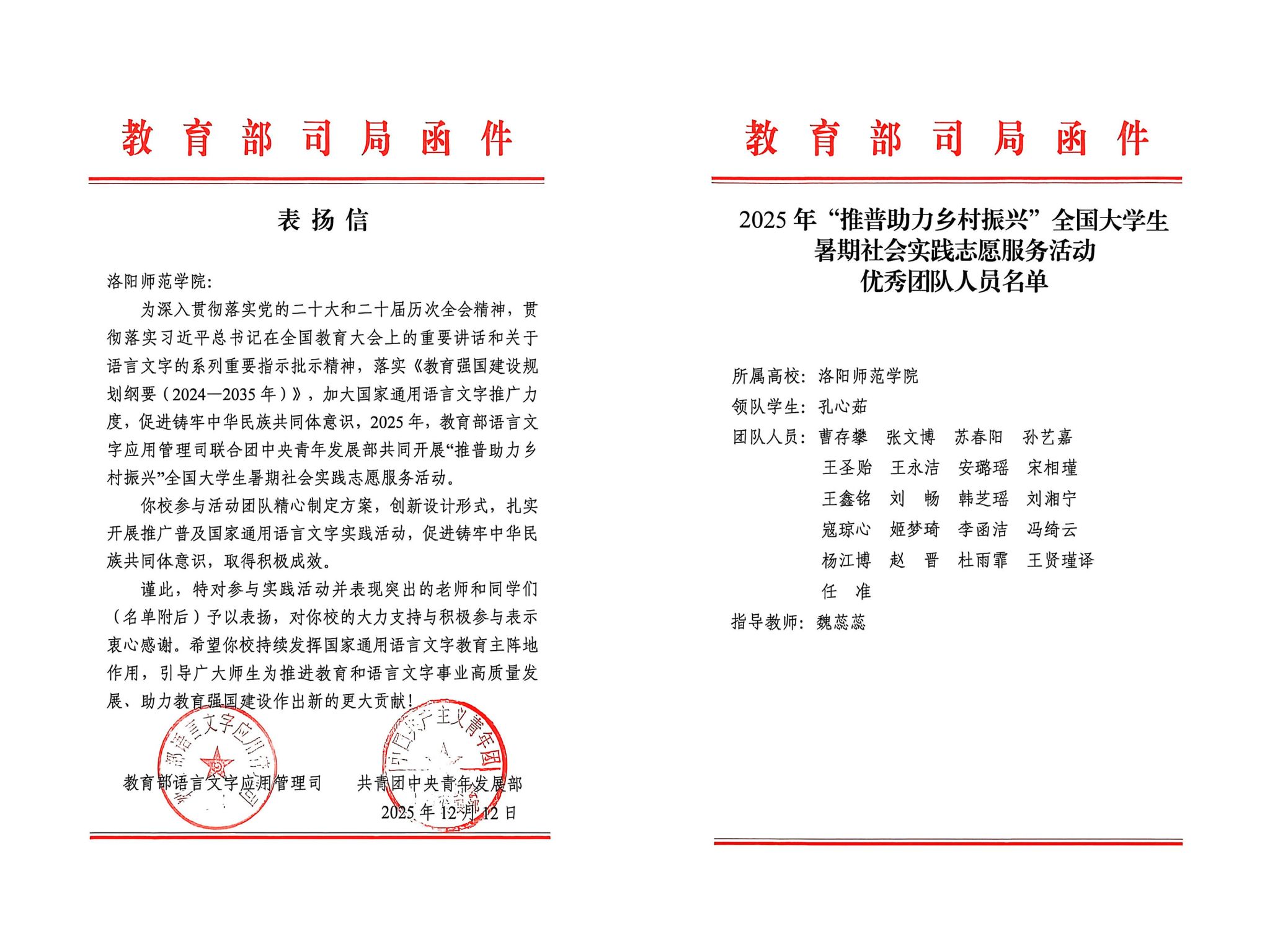 信中表示,在2025年“推普助力乡村振兴”专项活动中,实践队结合办学定位与专业特色,量身定制活动方案、创新设计形式,扎实开展推广普及国家通用语言文字实践活动,促进铸牢中华民族共同体意识,取得积极成效。