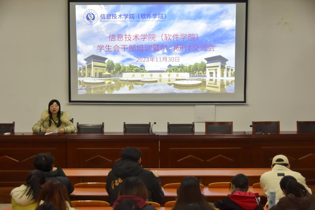 11月30日晚17时40分,我院于信息楼一楼报告厅召开学生会干部培训暨学习研讨交流会。学生会主席团成员主讲,团委副书记张倩倩主持,学生会全体成员积极参加,认真聆听。