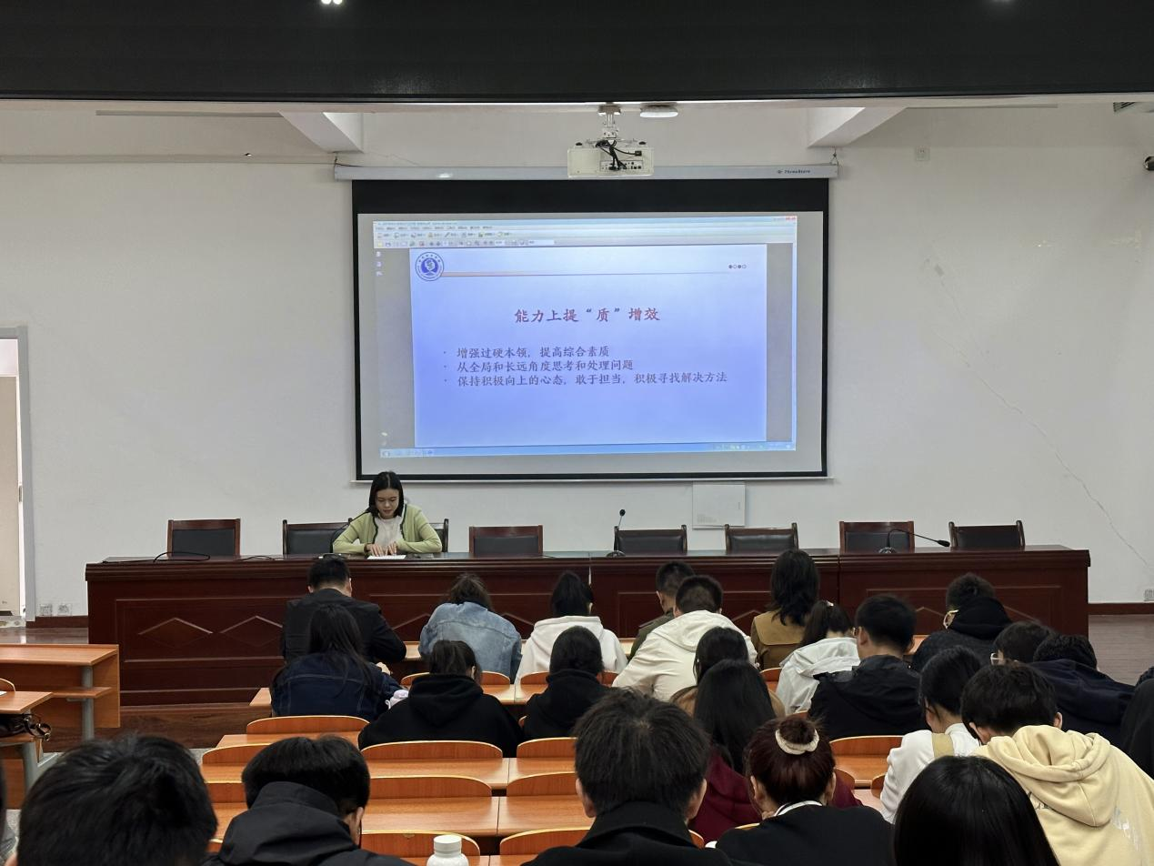 4月1日中午12时,我院于信息楼一楼报告厅召开以“新质生产力引领:青年学生干部挺膺担当”为主题的团学干部培训会,21级辅导员李婧怡主讲,全体辅导员及团学干部参加。
