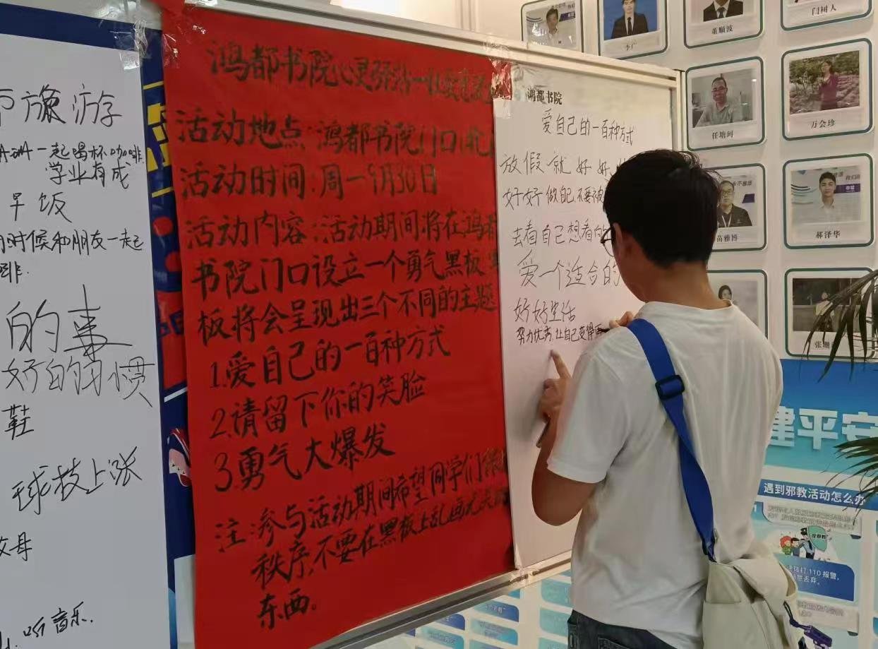 本次活动在鸿都书院1号学生社区育人导师、生活导师、朋辈导师和学生们共同参与的温馨氛围中拉开帷幕。书院门口设立了一块拥有"爱自己的一百种方式""请留下你的笑脸""勇气大爆发"三个不同主题的勇气黑板,同学们可以在黑板上尽情表达自己、展示自己。