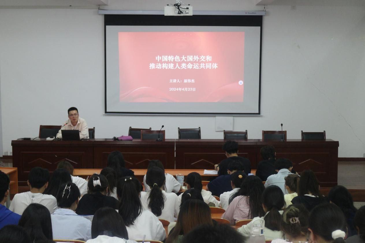 4月23日18时30分,我院23级辅导员原伟杰在信息楼一楼报告厅讲授专题党课“中国特色大国外交和推动构建人类命运共同体”,我院全体入党积极分子及预备党员参加。