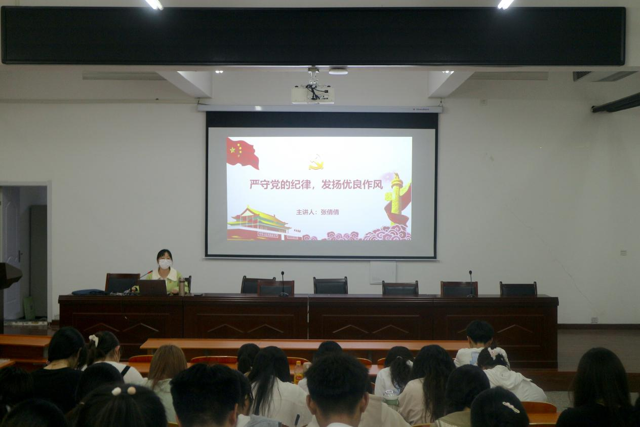 4月24日18时30分,我院22级辅导员张倩倩在信息楼一楼报告厅讲授“严守党的纪律,发扬优良作风”专题党课,全体入党积极分子及预备党员参加。