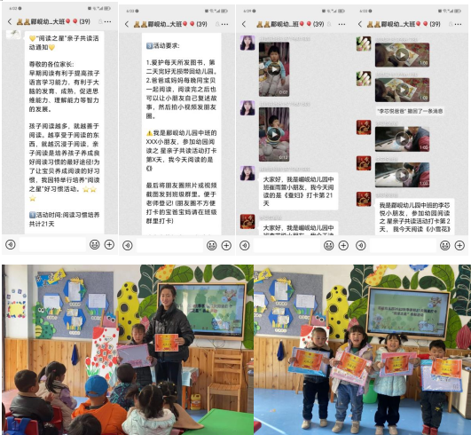 本次为“阅读之星”亲子共读21天打卡活动,早期阅读有利于提高孩子语言学习能力,有利于大脑的发育、成熟,促进思维能力、理解能力等智力的发展。孩子阅读越多,就越善于阅读;越享受于阅读的东西,就越沉浸于阅读,亲子阅读是培养孩子养成良好阅读习惯的最好途径!为了让幼儿养成阅读的好习惯,我园特举行培养“阅读之星”好习惯活动。首先,教师在家长会中给家长作出解读并宣传,然后在家长群里通知本次活动的要求,家长带领幼儿以视频形式开始阅读打卡,最后表彰打卡成功的幼儿。本次活动既激发了幼儿对阅读的兴趣,提高了幼儿的阅读能力,同时也增进了亲子关系,促进了家园更好的合作。