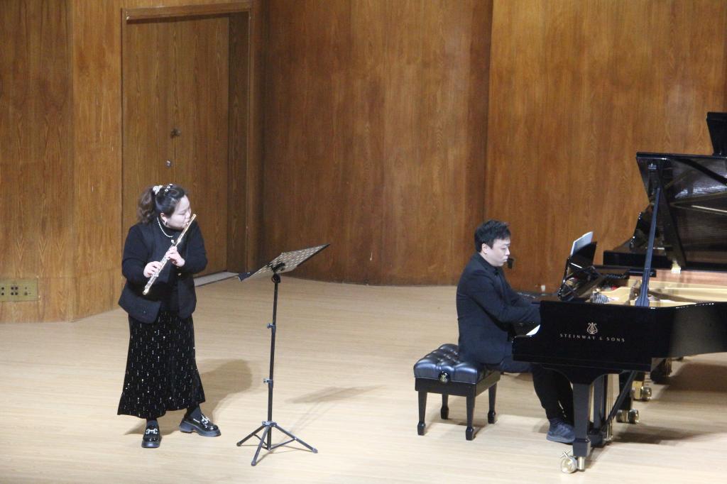音乐会曲目精彩纷呈。上半场中,刘哲老师和赵秋辰老师带来的双钢琴曲目《黄河钢琴协奏曲》将听众带入了黄河奔腾不息、气势磅礴的壮丽画卷中;宋歌老师演奏的长笛曲目《如歌与急板》旋律优美,节奏灵动。下半场中,由李梦媛老师带来的钢琴独奏曲《波兰舞曲》充满了活力与激情,展现出高超的演奏技巧;冯晔老师带来的钢琴独奏曲《梅花三弄》则将中国古典音乐的韵味演绎得淋漓尽致,让人陶醉其中。此外,还有众多老师的精彩演奏,赢得了现场观众的阵阵掌声。
