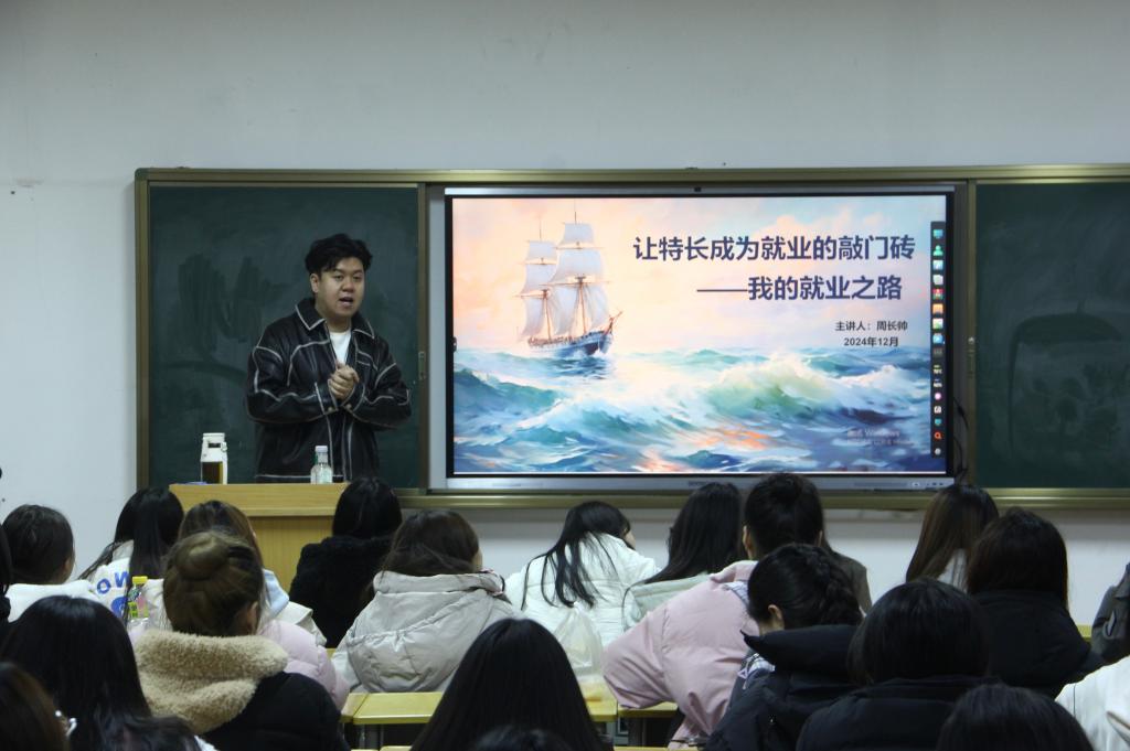在分享会中,周长帅讲述自己在大学期间的经历,回忆起自己加入洛阳师范学院广播站,经常主持学校重大活动的过往,经过自己不断地努力,在大二的暑假便有幸获得洛阳广播电视台的实习机会,让自己的特长爱好成为了就业的“敲门砖”。他强调,大学是促进自我发展的关键时期,同学们要善于抓住能够锻炼自我、获取经验的机会,不断提升技能,挖掘自身潜力。在竞争激烈的就业市场中,特长可以为个人在职场中赢得更多的发展机遇,助力职业生涯发展。最后,周长帅向大家分享了自己的演艺经历,鼓励大家走向更大的舞台,不断充实自己,让人生道路绚丽多彩。
