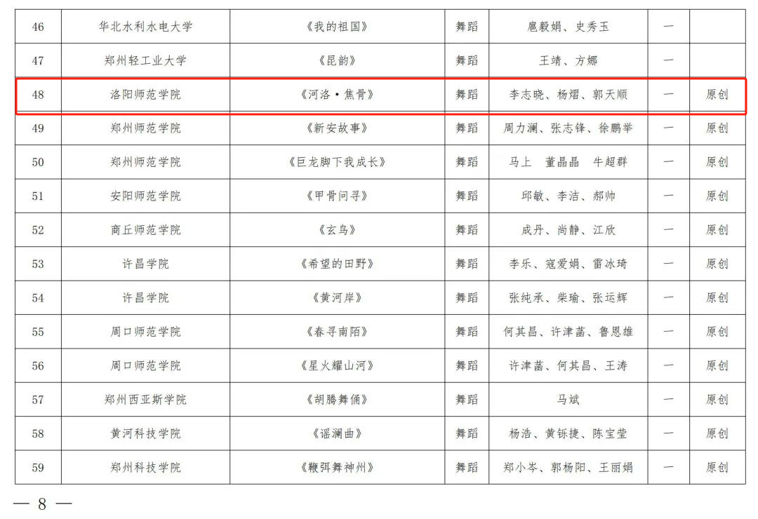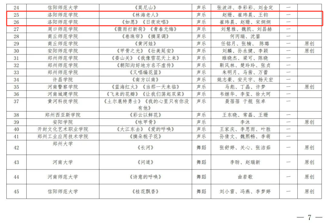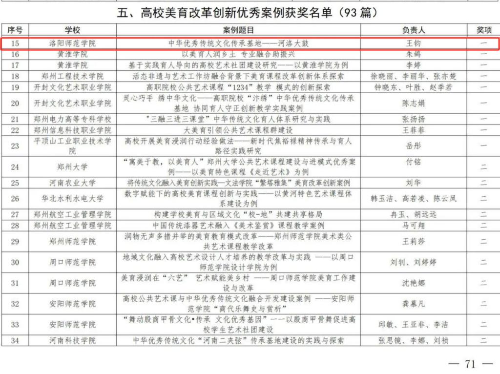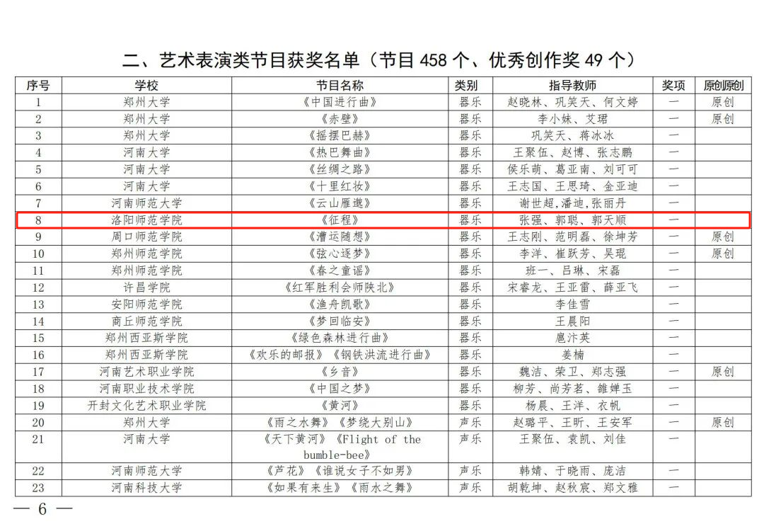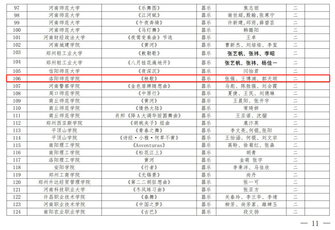 近日,河南省教育厅公布了河南省第七届大学生艺术展演活动获奖名单,我院取得了优异成绩。其中,管乐团带来的参赛作品《征程》荣获器乐类别一等奖;混声合唱团带来的参赛作品《林海老人》荣获声乐类别一等奖;天香合唱团带来的两首参赛作品《如愿》和《日夜欢唱》荣获声乐类别一等奖;舞蹈团带来的原创作品《河洛·焦骨》荣获舞蹈类别一等奖;竹乐团带来的参赛作品《秧歌》荣获器乐类别二等奖;《中华优秀传统文化传承基地——河洛大鼓》荣获高校美育改革创新优秀案例类别一等奖。