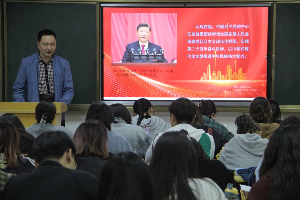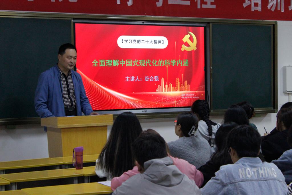 为深入学习贯彻党的二十大精神,以学促宣、深学笃行,引导全体学生把思想和行动统一到党的二十大精神上来,4月12日晚,我院特邀校党的二十大精神宣讲团成员谷合强为我院学子作“关于全面理解中国式现代化的科学内涵”的专题宣讲,宣讲会由辅导员闫欣珂主持。