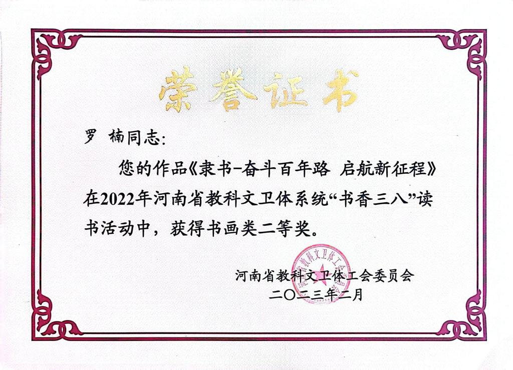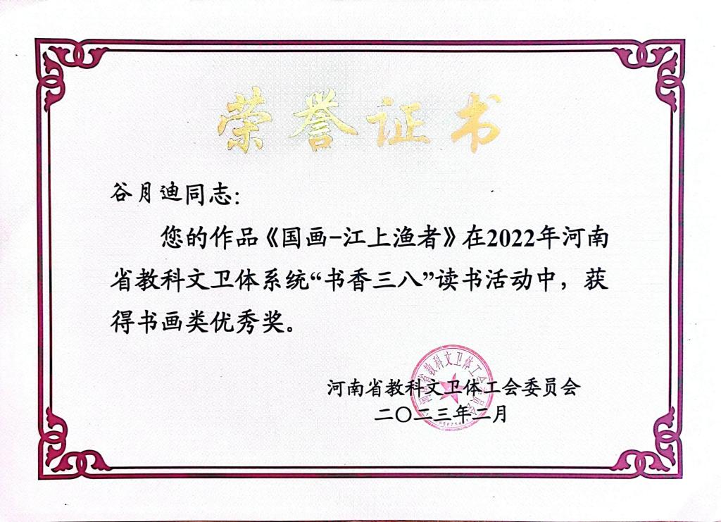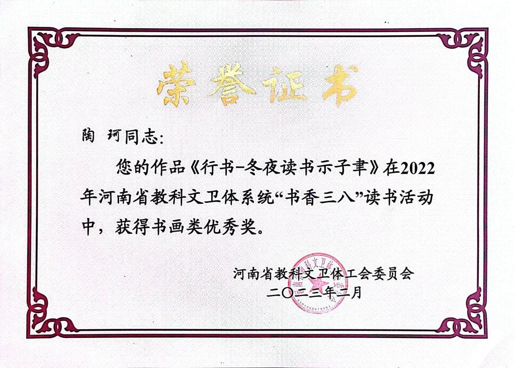 近日,我院教师在2022年河南省教科文卫体工会委员会举办的“书香三八”读书活动中获得佳绩。青年教师罗楠的作品《隶书—奋斗百年路 启航新征程》荣获书画类二等奖;陶珂的作品《行书—冬夜读书示子聿》荣获书画优秀奖;谷月迪的作品《国画—江上渔者》荣获书画类优秀奖。