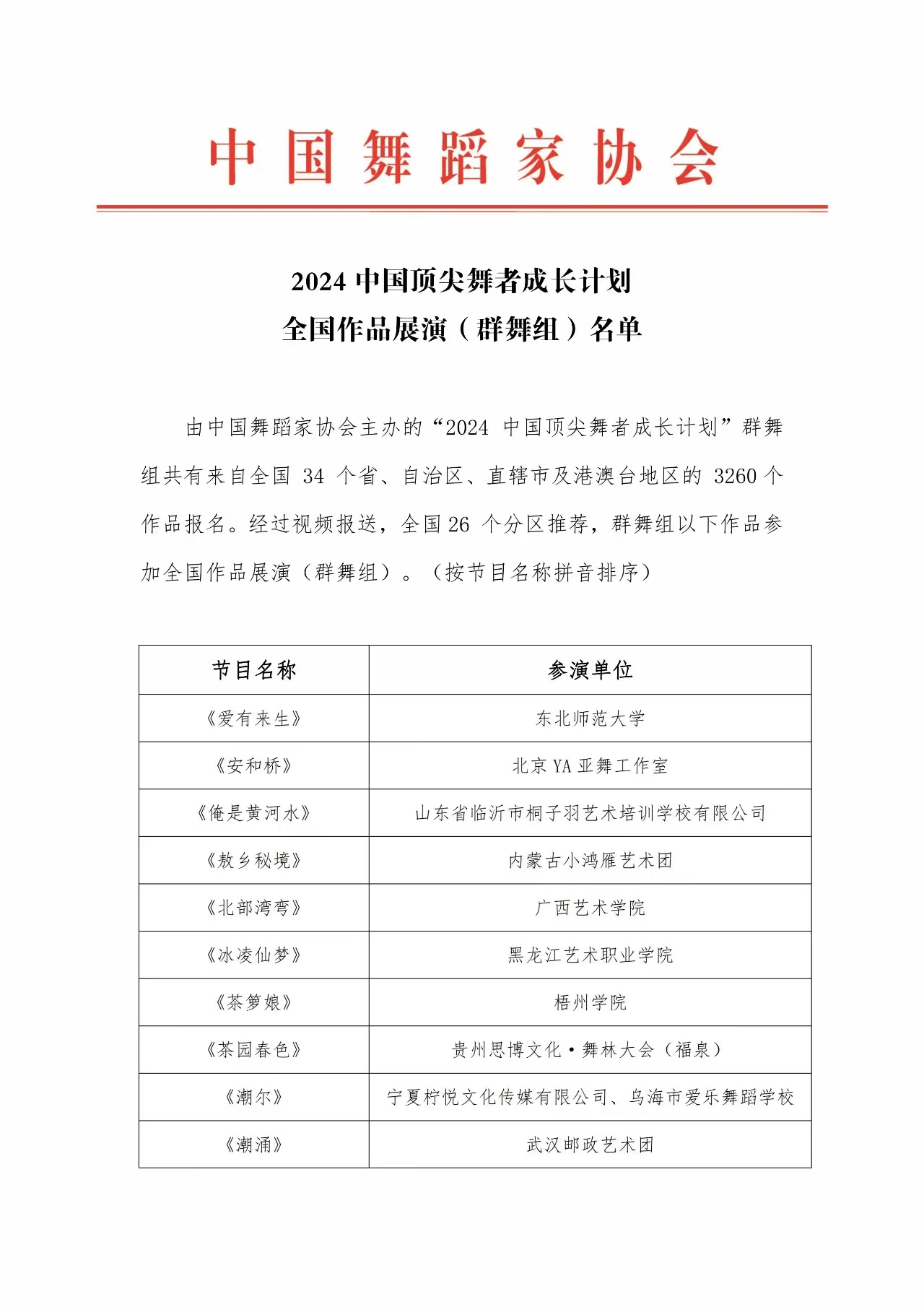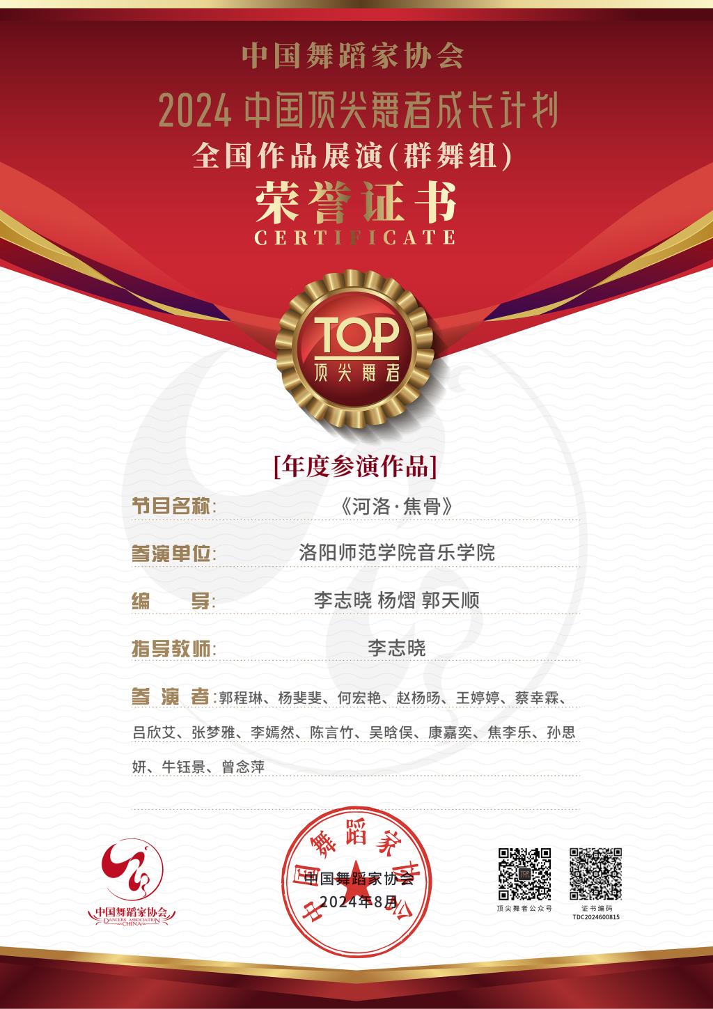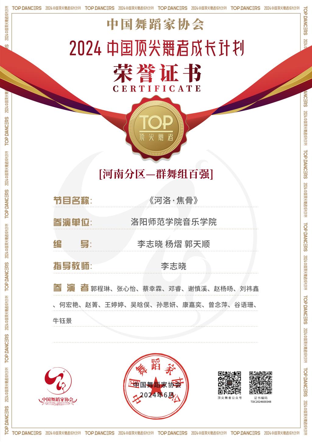 2024 年8 月 16 日至 21 日,由中国舞蹈家协会主办的“2024 中国顶尖舞者成长计划全国作品演出(群舞组)”在浙江省温州市温州大剧院举行。音乐学院节目《河洛·焦骨》在激烈竞争中荣获“河南百强”荣誉证书。