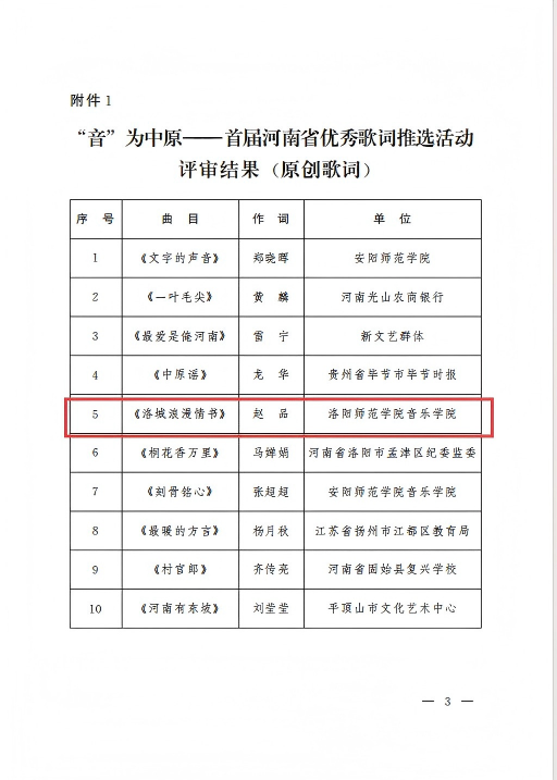 近日,河南省音乐家协会正式公布“音”为中原——首届河南省优秀歌词、歌曲评审活动结果,我院赵品老师原创歌词《洛城浪漫情书》成功入选终评并斩获优秀歌词奖项,用文字为中原文化添彩,彰显了我院艺术教育与创作实力。