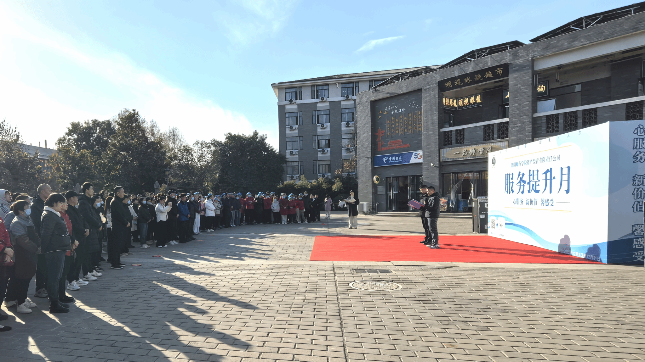 12月4日下午,资产经营有限责任公司“服务提升月”动员大会在桃园服务生活广场举行。公司董事长张永、总经理乔景润,各中心(部门)负责人、公司员工、各服务商户及代表共400余人参加启动仪式。