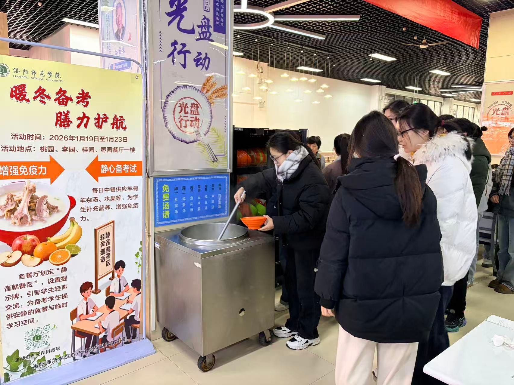 为缓解同学们的备考压力,切实保障寒假备考学生的膳食营养与学习需求,1月19日至23日,公司在桃园、李园、桂园、枣园餐厅一楼同步开展“暖冬备考,膳力护航”主题活动,以定制化餐饮与舒适环境为备考学子注入温暖能量。