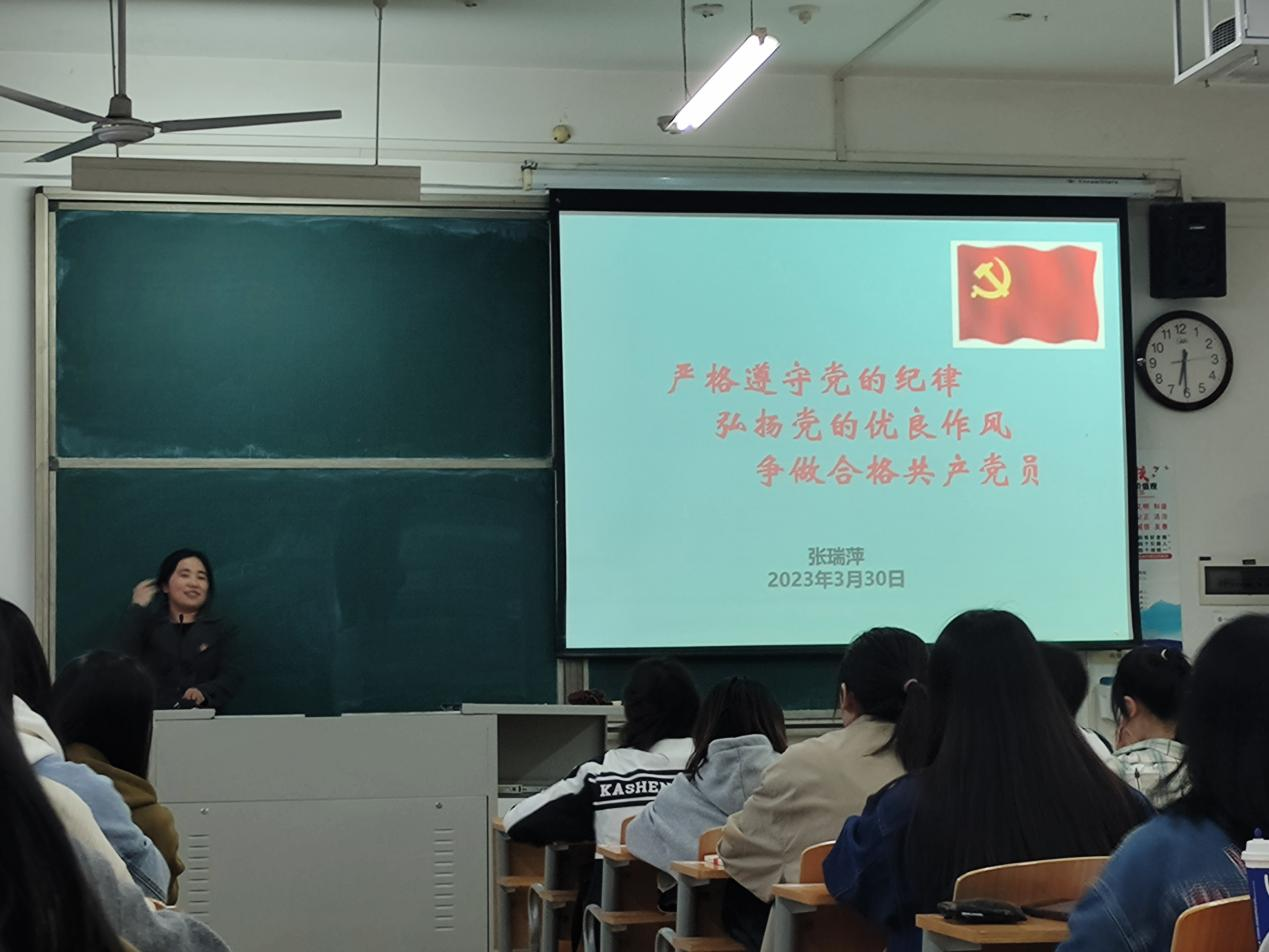 3月30日晚,商学院党委副书记张瑞萍以《严格遵守党的纪律,弘扬党的优良作风,争做合格共产党员》为题向参与培训的入党积极分子讲授党课。