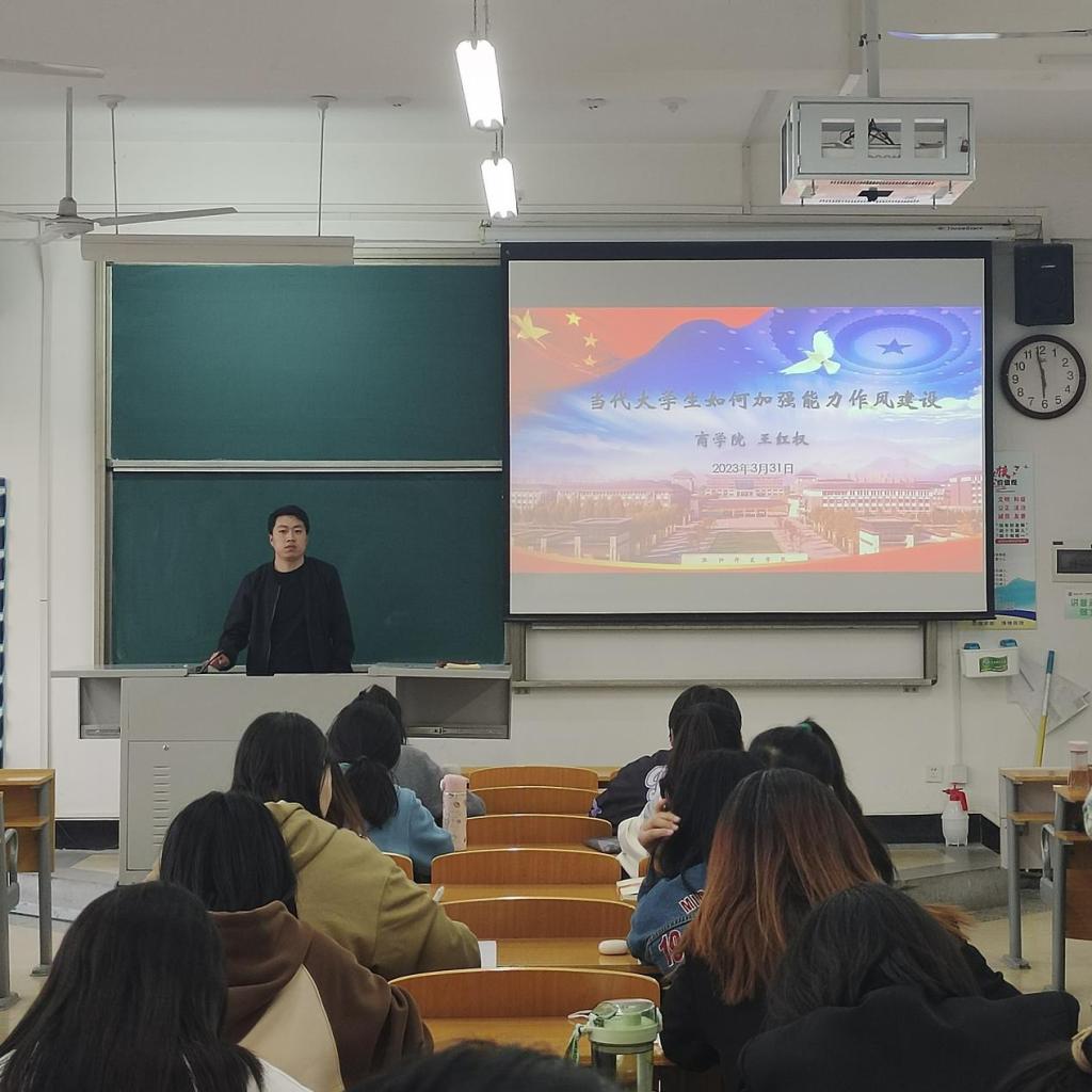 2023年3月31日晚,辅导员王红权老师以“当代大学生如何加强能力作风建设”为题讲授党课。