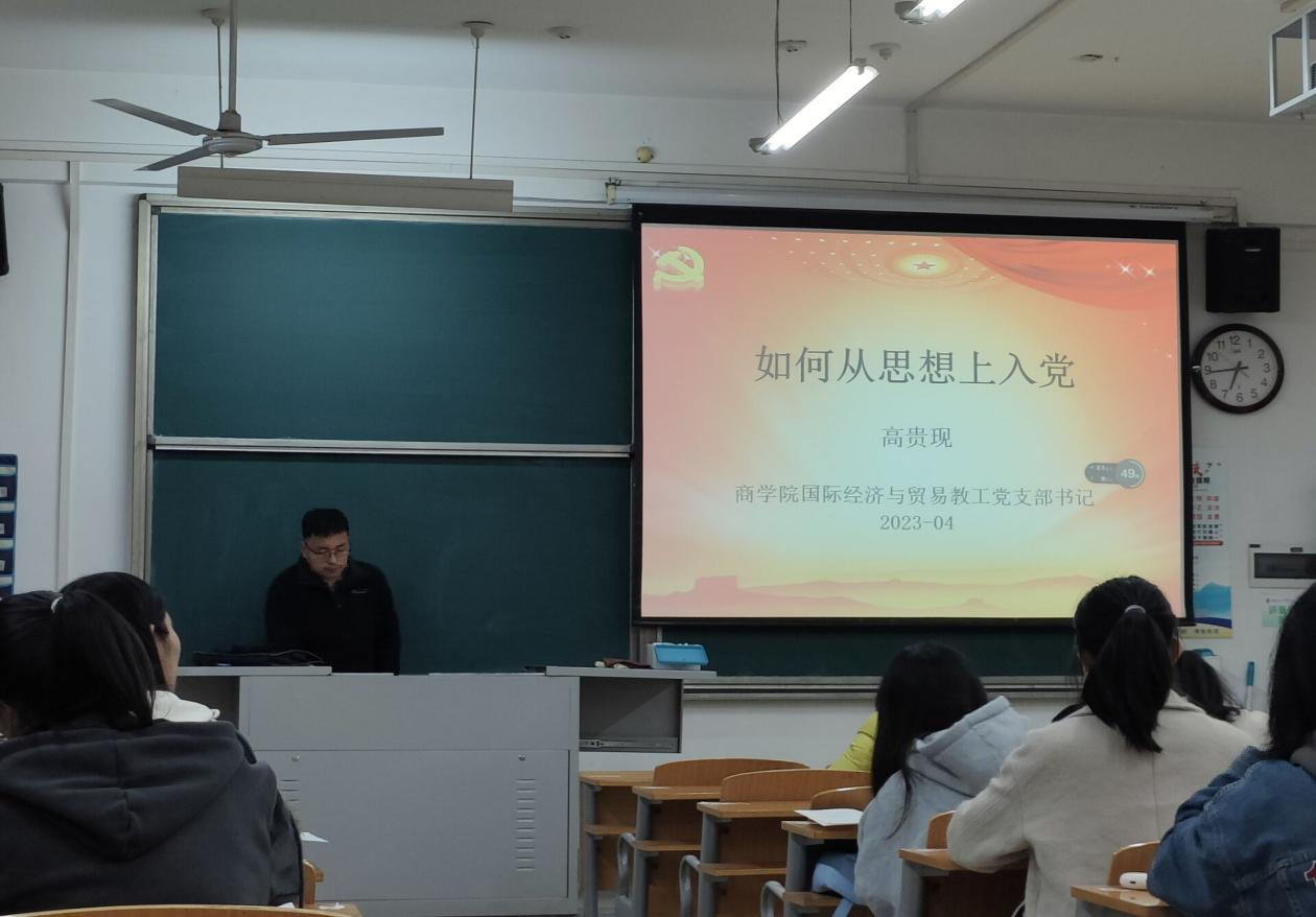 4月3日晚,商学院国际经济与贸易教工党支部书记高贵现以“如何从思想上入党”为主题在商学院A5-208教室为入党积极分子讲授党课。