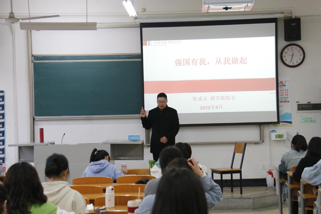 4月6日晚,商学院院长张成玉以“强国有我,从我做起”为题向参与党课培训的入党积极分子讲授党课。
