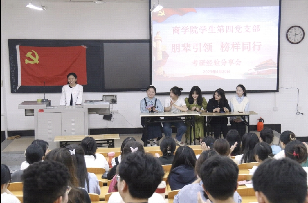 为深入营造以党建引领促学风,榜样示范共成长的良好氛围,4月20日下午,学生第四党支部在108教室开展“朋辈引领,榜样同行”主题党日活动。此次活动邀请5名考研上岸党员分享备考经验,学生第四党支部全体成员参加。