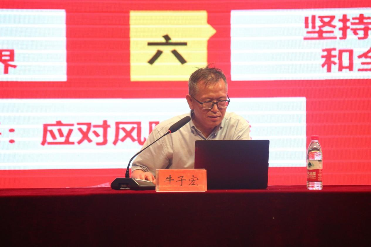 牛子宏从党的二十大的主题和主要成果、过去五年的工作和新时代十年的伟大变革、开辟马克思主义中国化时代化新境界、中国式现代化、全面建设社会主义现代化国家的目标任务、坚持党的全面领导和全面从严治党等方面展开讲解。他着重强调马克思主义必须同中国具体实际相结合这一关键性问题和中国式现代化的本质要求。牛子宏表示,当前我国正处在百年未有之大变局,国内和国际复杂形势环境给国家的长治久安带来了一定程度的风险挑战。党的全面领导是坚持和发展中国特色社会主义的必由之路,中国特色社会主义是实现中华民族伟大复兴的必由之路,团结奋斗是中国人民创造历史伟业的必由之路,贯彻新发展理念是新时代我国发展壮大的必由之路,全面从严治党是党永葆生机活力、走好新的赶考之路的必由之路。这是我们在长期实践中得出的至关紧要的规律性认识,必须倍加珍惜、始终坚持,咬定青山不放松,引领和保障中国特色社会主义巍巍巨轮乘风破浪、行稳致远。