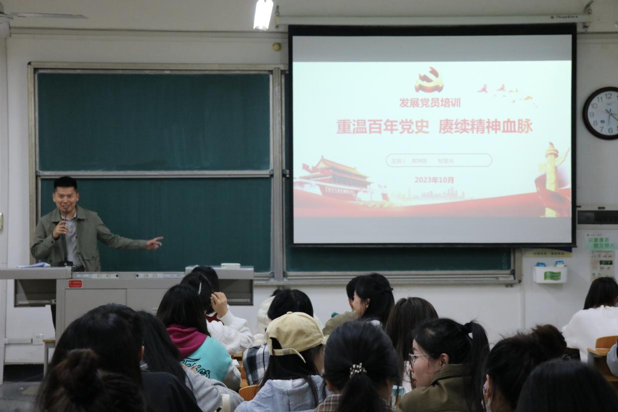 2023年10月20日晚,商学院辅导员杨旭兵以“重温百年党史,赓续精神血脉”为题向商学院入党积极分子和预备党员讲授党课。