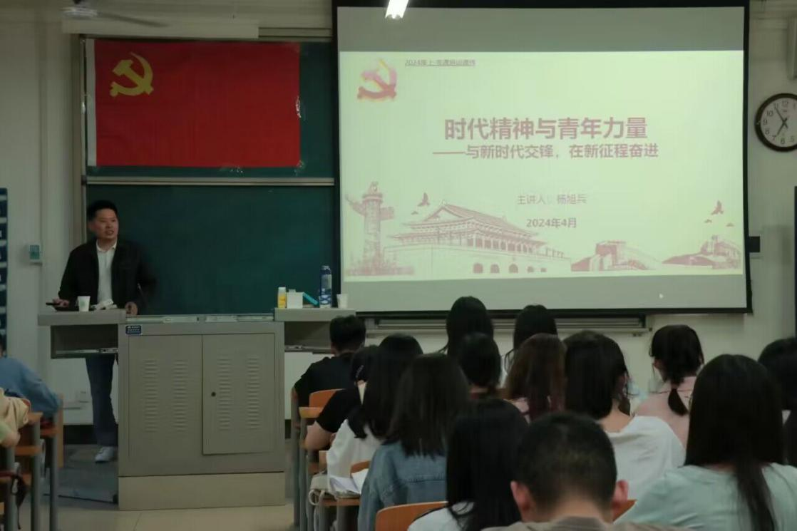4月24日晚,商学院2023级辅导员杨旭兵以“时代精神和中国力量”为题,向入党积极分子和预备党员讲授党课。