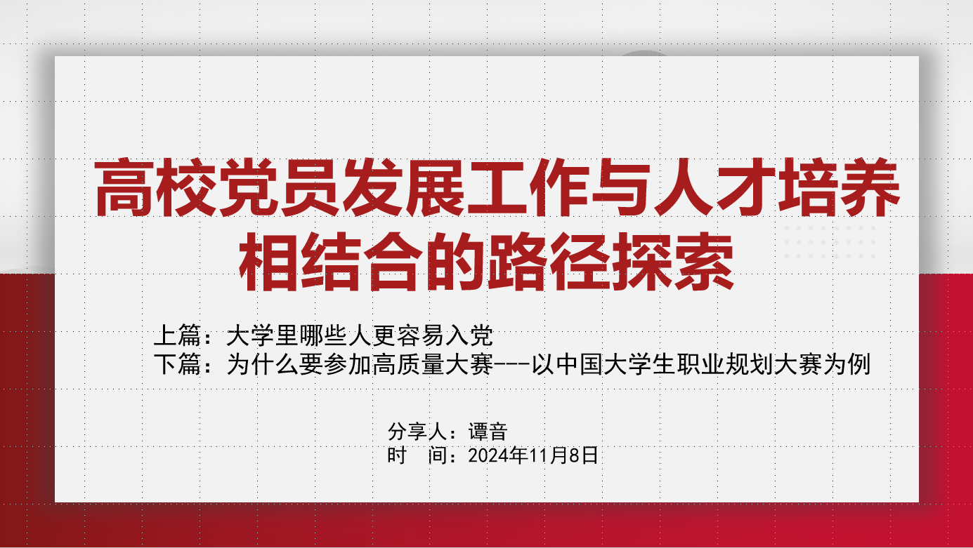 “哪些大学生更容易获得入党机会?”谭音在讲授开始前抛出问题,引发学员们的思考。她表示,在大学校园里,那些积极向党组织靠拢的同学往往在各方面都展示出了较高的素质,每年都会有很多学生递交入党申请书,但最终能顺利入党的同学具备相似的特质,学习成绩优异、全面发展、积极主动且群众基础良好。随后,谭音立足党员的培养发展,以中国大学生职业规划大赛为例向在座的同学们分享参加高质量大赛对个人成长发展的重要意义。