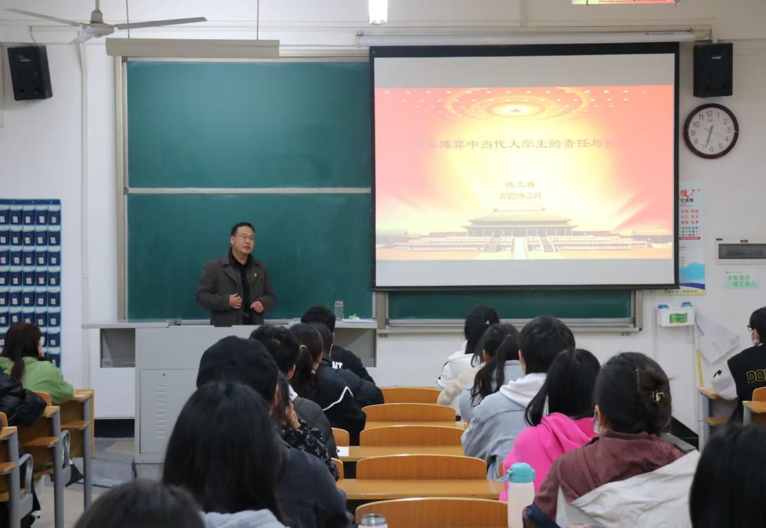 陈立栋从中美博弈的时代背景和中美博弈的主要方面就中美博弈进行了解读。他强调说,虽然中国无意挑战美国,但美国感到了威胁并采取行动,中国当前所面临的来自美国的一切挑衅和压力,都是美国统治阶层一直遵循的霸权主义的逻辑使然。陈立栋就中美博弈中当代大学生的责任与担当,就学生干部们在如今复杂多变的形式中,如何发挥好模范带头作用,保持坚定的民族自信心与自豪感进行了指导。他表示,相较于西方人亡政息的民主选举常态而言,中国共产党践行人民为中心的发展思想,发挥着社会主义集中力量办大事的制度优势,更加具备有效应对前进道路中风险挑战的能力。面对当前复杂多变的国际形势,陈立栋勉励学生干部们既要志存高远,也要脚踏实地。在新时代涵养爱国情怀,夯实团结作风,激发奋斗精神,锤炼担当品德,做堪当民族复兴大任的时代新青年。