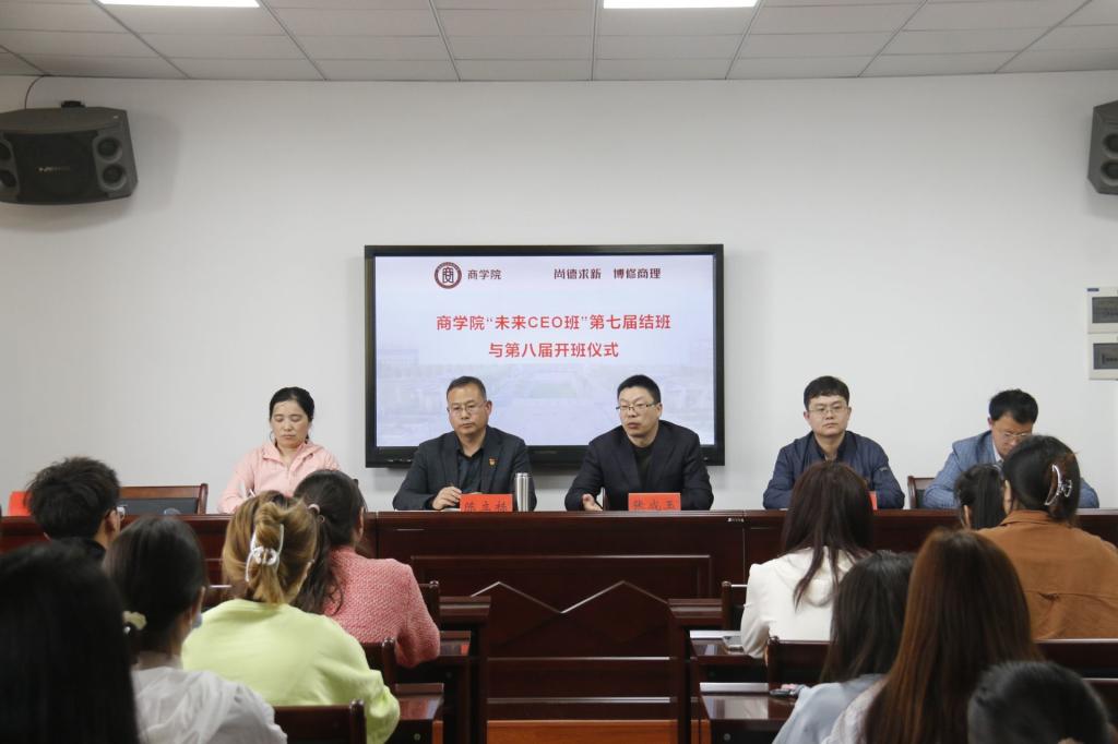 会上,张瑞萍详细地介绍了商学院未来CEO班的发展历程,余江波对班级未来发展方向作系统性规划。他们表示,未来CEO班是学院创新创业的重要载体,班级教学计划曾获得省级优秀教学成果,未来班级发展将结合学校当前双创发展规划,着力培养一批具有创新力和实践力的新型人才。随后,班主任王烁对第七届未来CEO班一年来的活动成果进行总结,对学员能力的提升表示肯定并与出席的领导一同为第七届CEO班的11位优秀学员颁发荣誉证书。王烁说,作为新一届CEO班的一员,每一位同学都要传承发扬好良好的班风,遵守班级规章制度,师生协力打造具有创造力的特色班级。