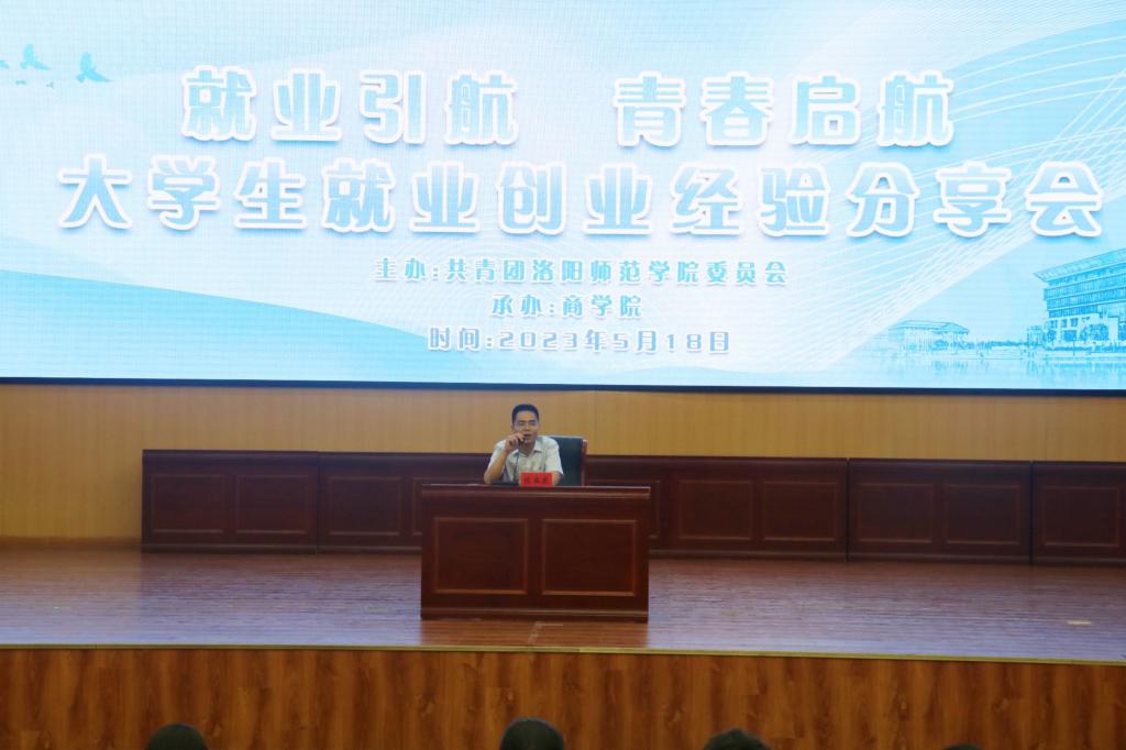 5月18日下午,由共青团洛阳师范学院委员会主办,商学院承办的 “就业引航,青春启航——大学生就业创业经验分享会”于G1-112教室顺利举行。本次分享会特邀洛阳市品学文化传播有限公司创始人刘玉玺、中国银行谷水支行行长陈亚东、商学院余珂博士做主题分享。
