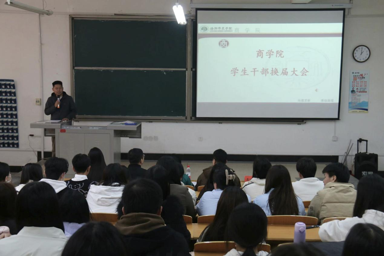 为进一步完善我院学生干部队伍建设工作,确保学院学生管理工作的传承性与连续性,我院于12月7日下午在A5-109教室召开学生干部换届大会。商学院党委副书记张瑞萍及全体辅导员老师受邀出席本次大会。
