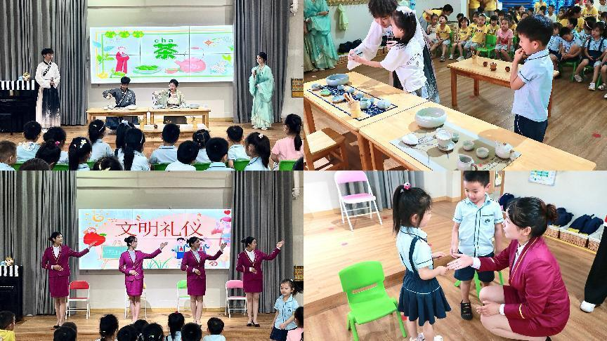 茶艺演绎环节,在舒缓的中国古典音乐中,实践队员向小朋友们娓娓道来讲述泡好一盏茶的技艺。从温杯、投茶、润泡、冲茶、出汤到敬奉香茗,队员们身着汉服展示着一整套茶艺表演。互动环节,小朋友们在轻松愉悦的环境中认识了解“茶艺六君子”,并认真学习不同茶具的用途。现代礼仪展示环节,实践队四位礼仪老师向小朋友们表演自创的礼仪操,分别展示“站姿、坐姿、指引礼、抚裙礼”,并深入到小朋友之中悉心指导纠正大家的行为动作。