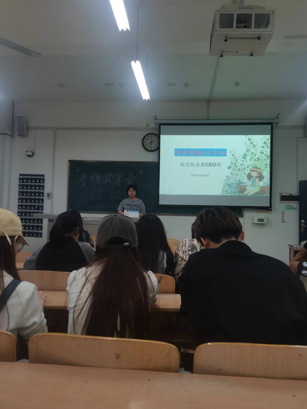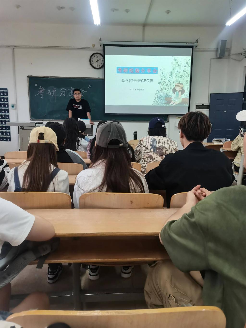 为了加强未来CEO班学生对考研政策的了解,科学掌握备考方法,4月18日,在班主任王烁的组织下未来CEO班组织开展考研经验分享会。本次活动邀请考研成功上岸的优秀学员代表朱云川、付少帅、兰佳粮、樊一鸣做经验分享。