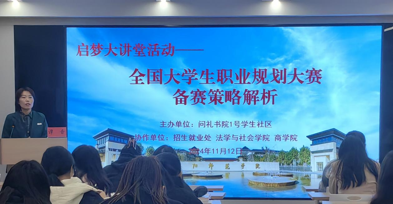 为教育引导大学生增强职业生涯规划意识,11月12日晚,由问礼书院1号学生社区主办,招生就业处、法学与社会学院以及商学院协办的启梦大讲堂系列活动之“全国大学生职业规划大赛备赛策略解析”顺利举办。本次讲座由谭音老师担任主讲,为同学们分析职业规划大赛备赛的策略,书院学生积极参加。