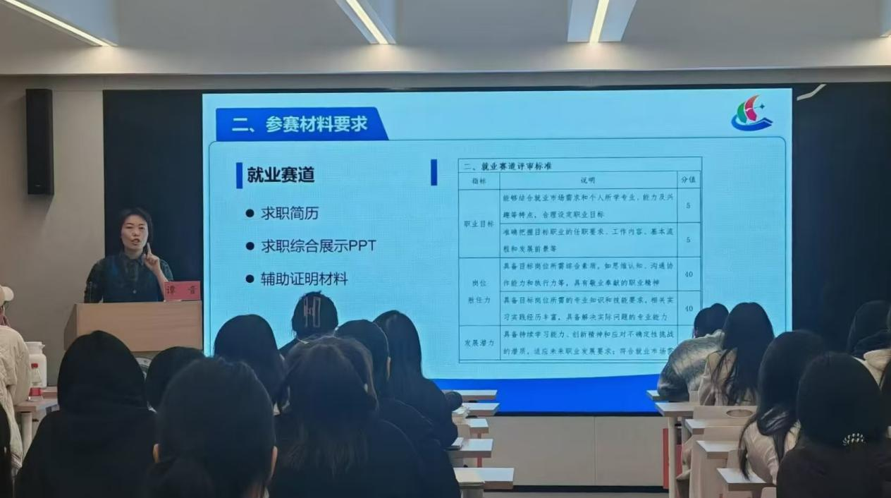 首先,谭音强调了职业规划大赛对于大学生的重要性,其次谭音从参赛材料要求、评审标准、职业规划书制作、参赛PPT制作和简历设计等方面对大赛进行详细讲解。最后,谭音鼓励学生们要以认真细致的态度积极参加全国大学生职业规划大赛。