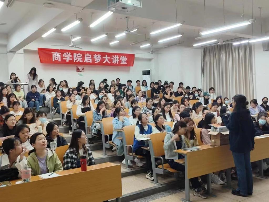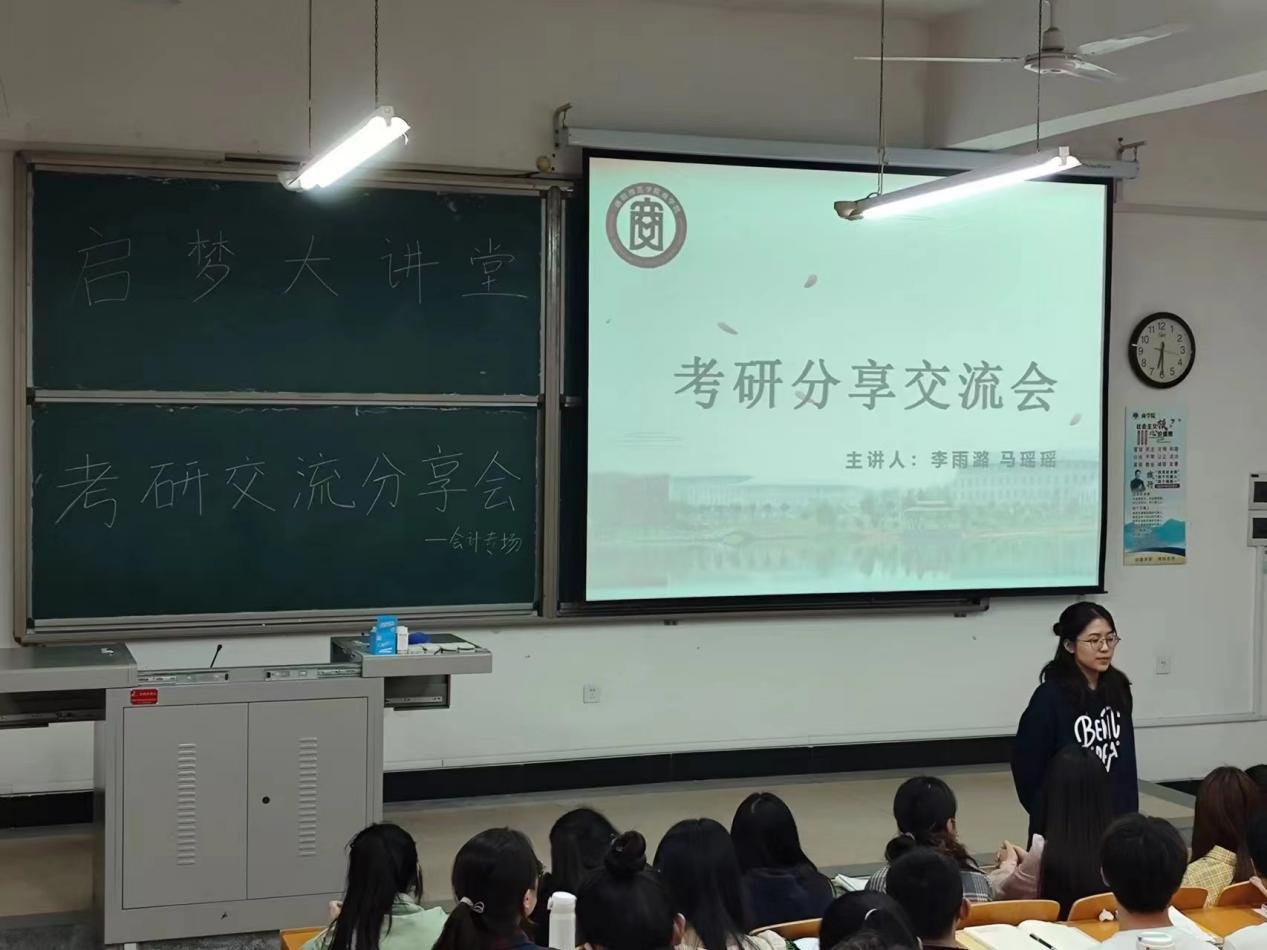 4月18日晚,由招生就业处主办商学院承办的启梦大讲堂系列讲座之考研交流分享会——会计专场在A5-109教室成功举办。本次讲座由商学院23届考研优秀代表李雨潞、马瑶瑶两位同学担任分享人,商学院120余位学生参加了本次讲座。
