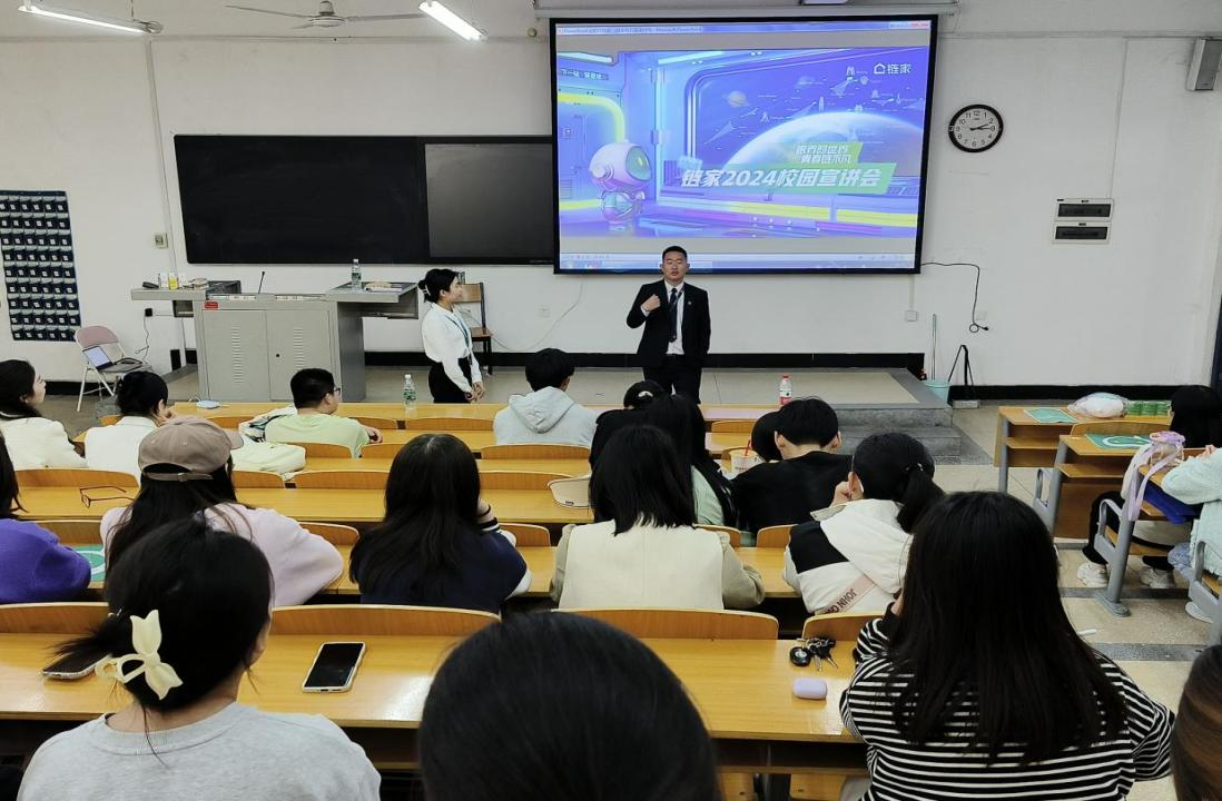 上海链家房地产经纪有限公司成立于2008年,业务覆盖中国29个城市和地区,是一家主要从事房地产业务的企业。此次宣讲会面向我校学生主要招聘房产经纪人。宣讲会伊始,主讲人通过公司宣传片和PPT详细介绍了企业历史、发展概况、工作内容和薪酬福利,使同学们对链家有了更深入的了解。紧接着是互动环节,招聘负责人为同学们答疑解惑,讲解了线上线下面试的具体步骤,他鼓励同学们提高综合素质,发挥专业优势,争取更好的就业机会。