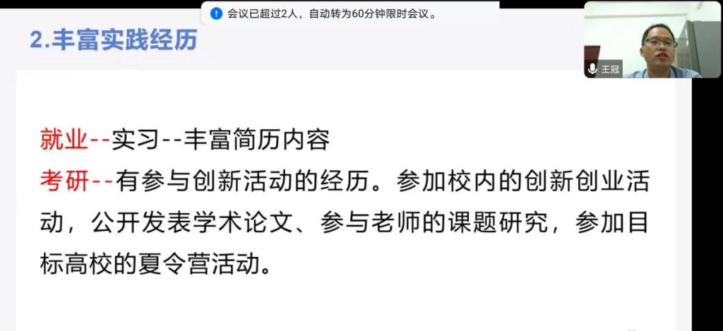 邀请企业家进课堂是提升本科教学质量的一项重要举措,为了强化搭建学生对未来就业行情的了解,提前做好就业规划。2024年5月20日,特邀请广西财经学院党委宣传部副部长王冠为2021级工商管理1班的学生做关于“大学生如何做好职业规划”为主题的线上讲座。