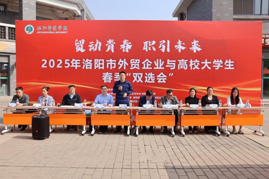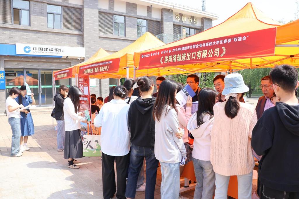 为助力学生拓宽就业渠道,明晰职业发展方向,4月20日上午9点,由洛阳师范学院商学院联合洛阳市商务局、洛阳市进出口企业协会、河南科技大学、洛阳理工学院及洛阳市泞泽职业培训学校共同主办的2025年洛阳市春季高校大学生与外贸企业双选会在我校桃园生活广场隆重举行。来自洛阳师范学院、河南科技大学、洛阳理工学院的近1000名学生积极参与,与32家优质外贸企业展开深入交流。