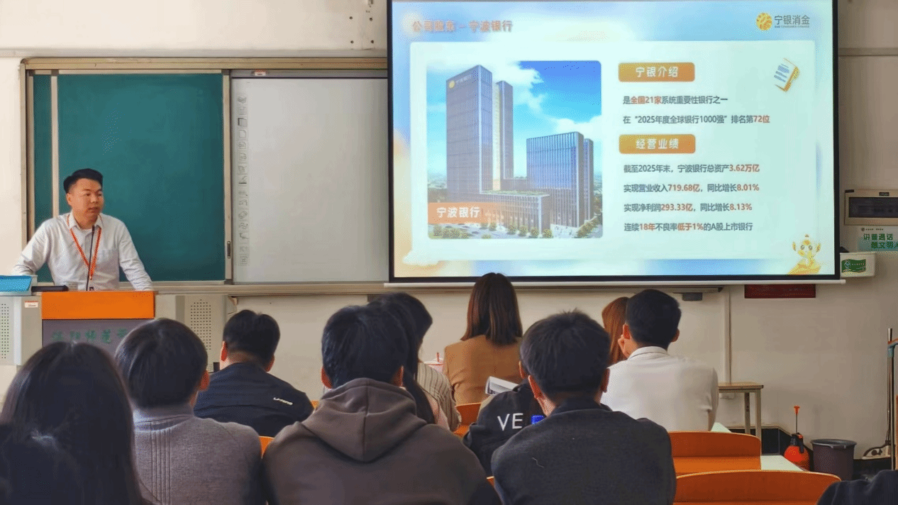 2026年3月28日,宁波银行在商学院209教室举办春季招聘宣讲会。招聘官陈贞先生围绕“消费金融定向生”岗位及其特色成长路径,向在场学生作了系统介绍。