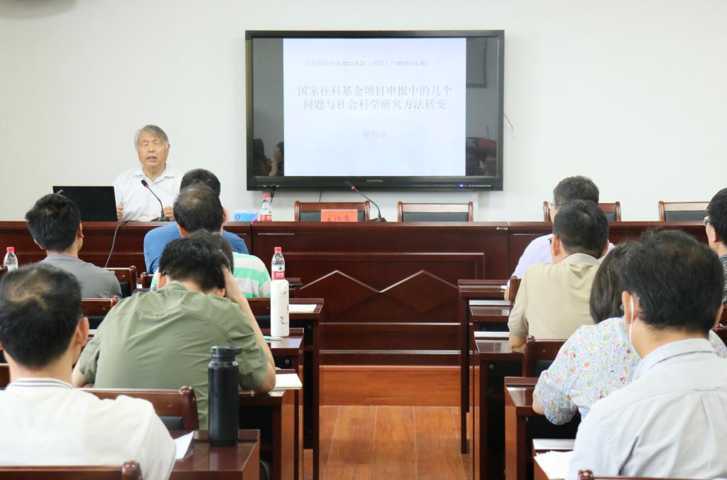 会上,耿明斋教授以“国家社科基金项目申报中的几个问题与社会科学研究方法转变”为题从国家社科基金项目基本情况、如何选题、如何论证、如何转变研究方法四个方面提出指导意见。他强调了“选题是关键,论证最重要”,要将选题与自己最熟悉的领域相聚合,明晰论证的内在逻辑。他结合自身科研经历和基金申报经验从高校社会科学研究如何面向现实并解决困难和教师提升研究能力的方法途径两大模块进行了详细又深刻的讲解。他表示,社会科学研究方法的转变在于“问题意识”,从问题出发,在理论与现实中转换研究思路,寻找创新点。研究要从身边小事入手,抓住问题,洞悉全局,要时刻关注国家重大战略需求、重要学术前沿问题以及重大社会关切问题。
