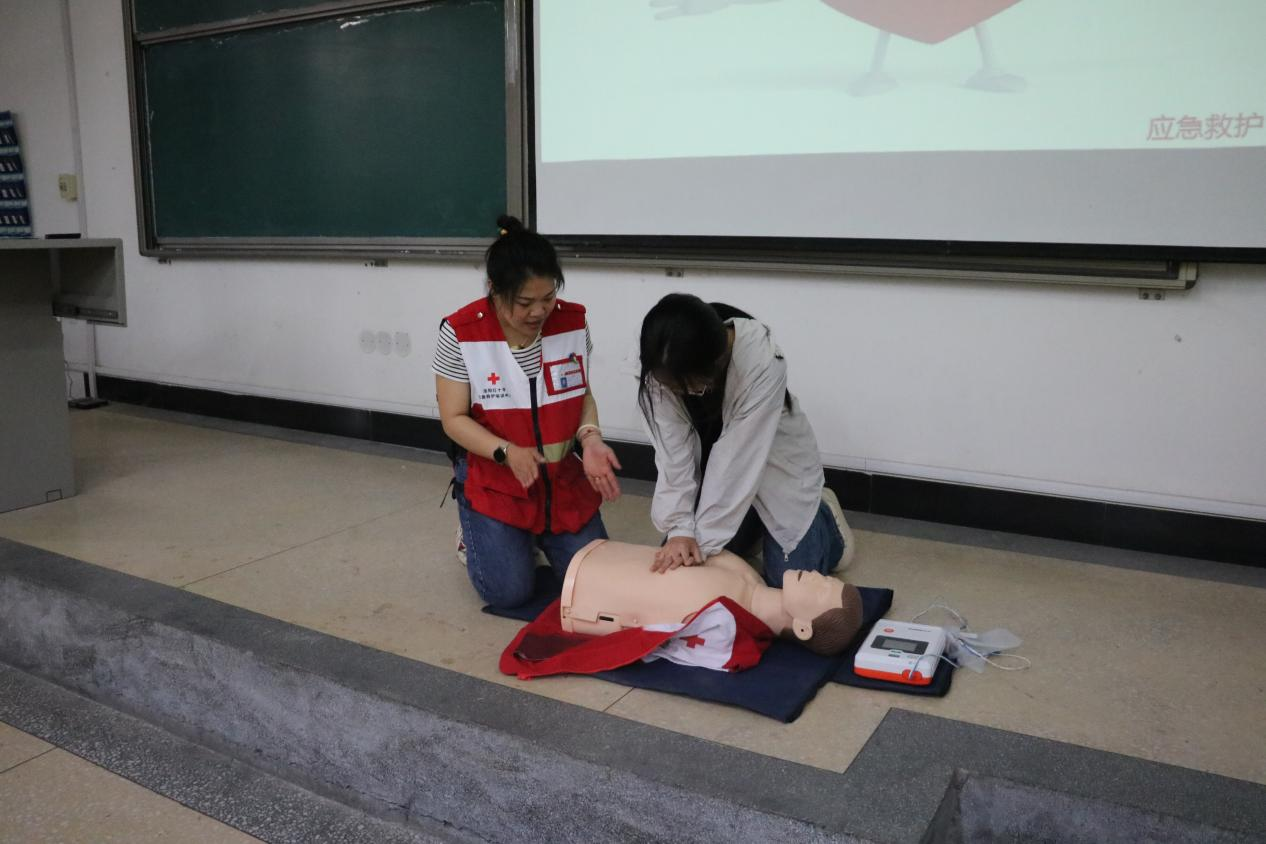 此次培训由中国红十字救护培训师毛媛媛主讲,她采用理论知识教学和实操演练相结合的方式向同学们生动形象地讲解红十字运动知识与救护概念、现场徒手心肺复苏术(CPR)、海姆立克急救法和自动体外除颤仪(AED)操作等应急救护知识。实操演练环节,毛媛媛从判断意识、现场呼救、检查脉搏呼吸、启用AED并开展心肺复苏详细地演示了突发情况下开展人员施救的完整流程。在座的同学认真学习动作要领并通过模拟人实操练习,培训师耐心细致地指导并纠正同学们的操作动作。