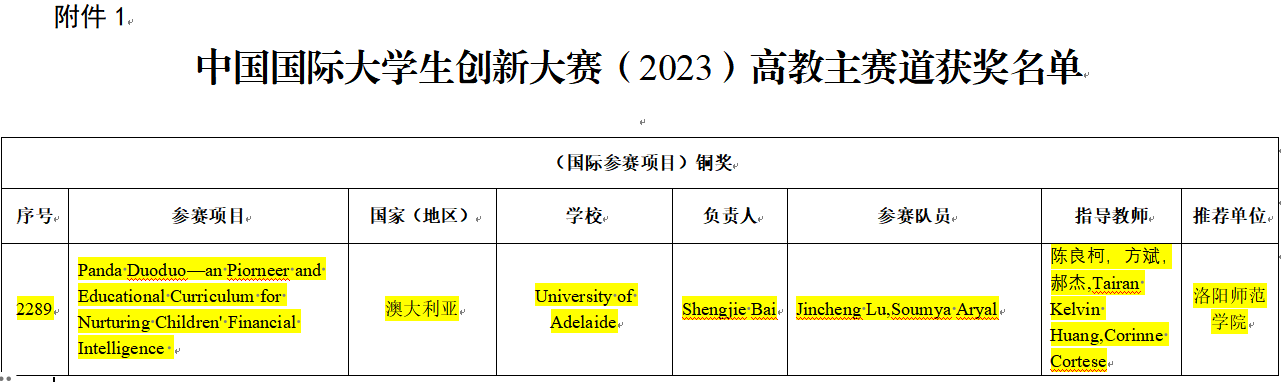 近日,教育部公布了中国国际大学生创新大赛(2023)高教主赛道国际项目获奖名单,由我院陈良柯老师等人指导的项目“Panda Duoduo—an Piorneer and Educational Curriculum for Nurturing Children' Financial Intelligence”从数万个国际参赛项目中脱颖而出,斩获国家级铜奖,实现了我校在该项赛事的新突破。