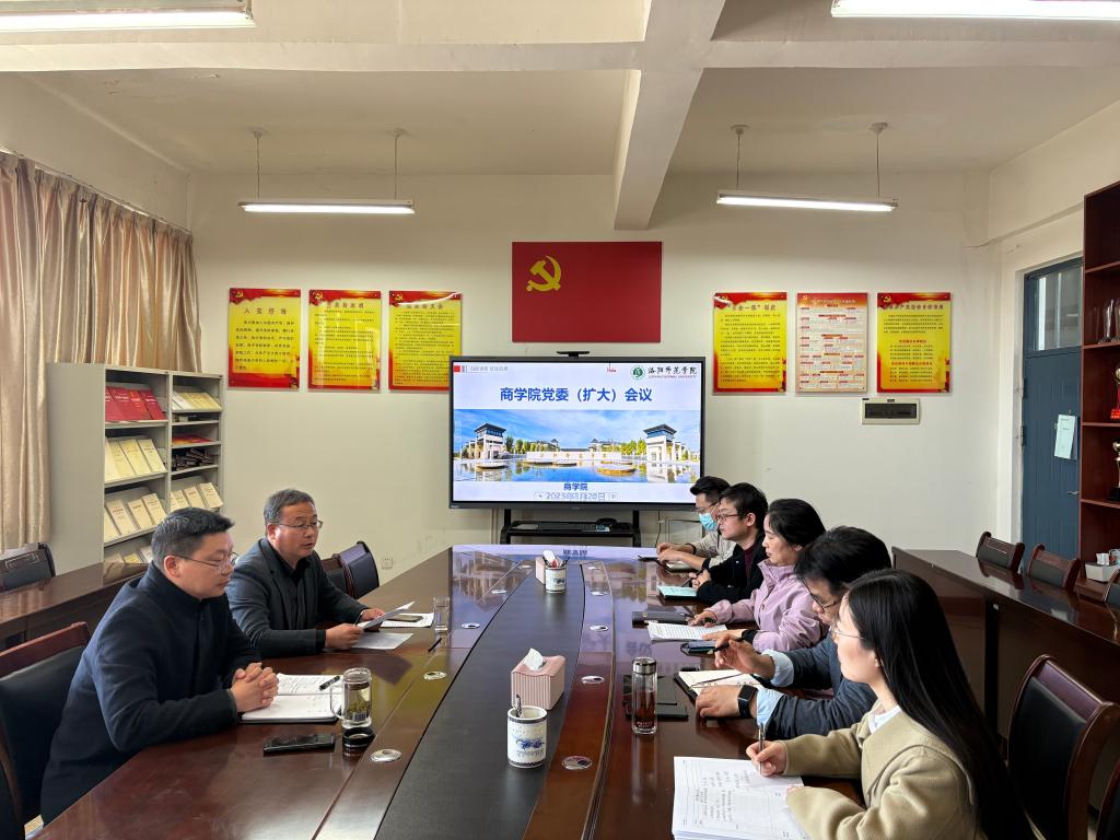 3月20日下午,我院在A5-516会议室召开商学院党委扩大会议,学习贯彻习近平总书记关于深入贯彻中央八项规定精神学习教育的重要讲话和重要指示精神,传达学习中央、省委和学校党委关于开展深入贯彻中央八项规定精神学习教育的有关会议精神和工作要求,研究部署我院深入贯彻中央八项规定精神学习教育工作。学院领导班子成员、各党支部书记参加会议,会议由党委书记陈立栋主持。
