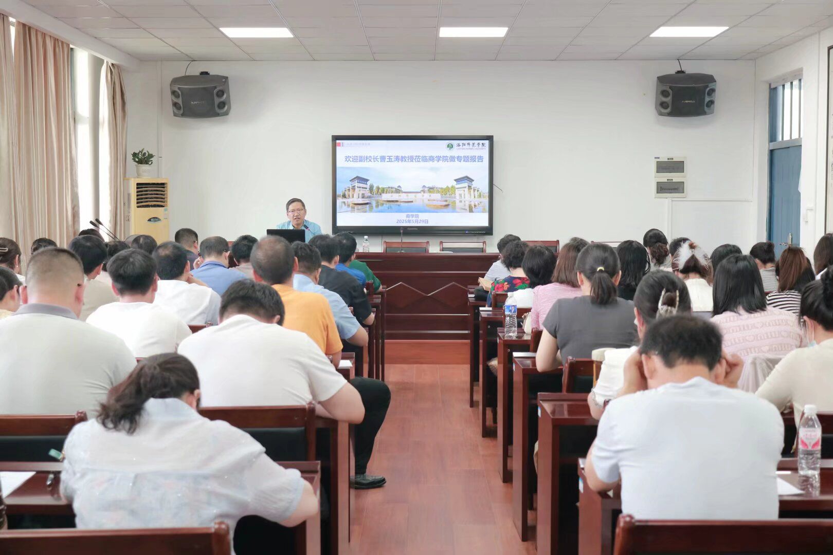 5月29日下午,副校长曹玉涛在商学院514会议室为全体教职工进行理论辅导报告。