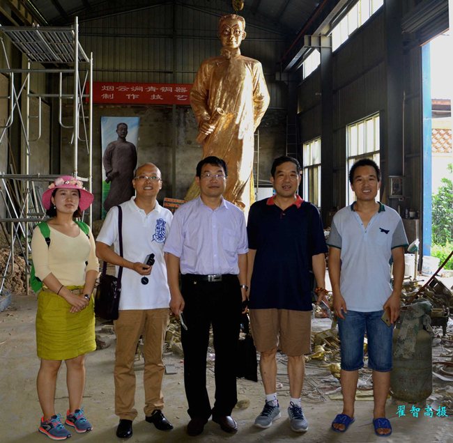 刘占斌一行实地参观考察了烟云涧青铜工艺博物馆综合展厅、精品厅、电商室、制模车间。并在即将完工的伟大的人民教育家陶行知铜像前合影。