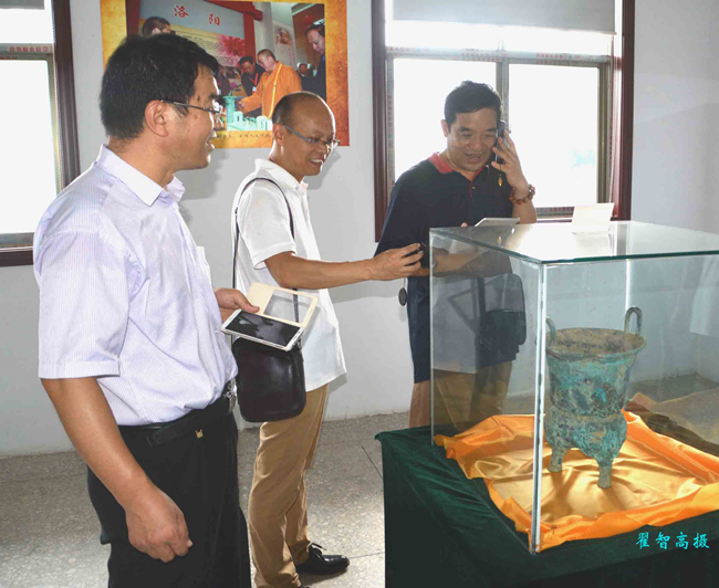 8月13日上午,市社科联副主席刘占斌,洛阳商学院院长刘玉来,洛师商学院讲师郑菊花博士,洛师艺术设计学院视角传达系主任马柯一行,不顾高温酷暑,专程到闻名遐迩的青铜古镇洛阳烟云涧青铜器有限公司进行调研。